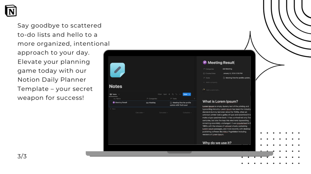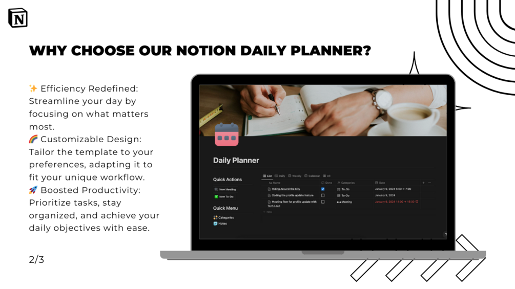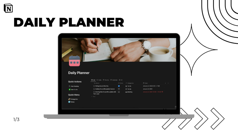 Say goodbye to scattered to-do lists and hello to a more organized, intentional approach to your day. Elevate your planning game today with our Notion Daily Planner Template – your secret weapon for success!